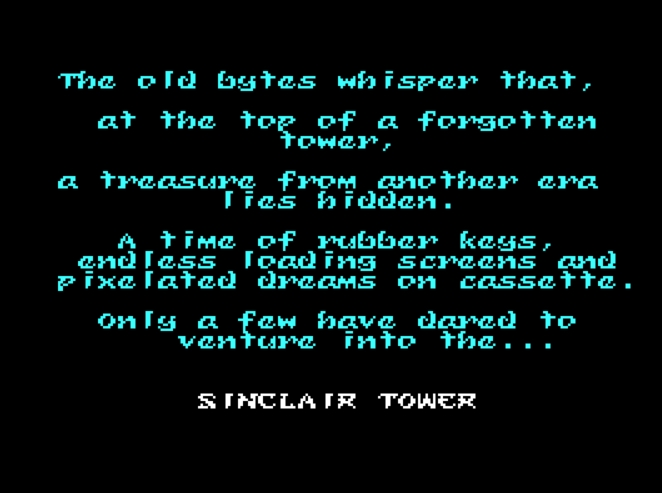 The old bytes tell of a forgotten tower hiding a treasure from another era. A time of rubber keys, endless loading screens, and pixel dreams on cassette tapes. Only a brave few have dared to enter… the Sinclair Tower. Do you accept the challenge?